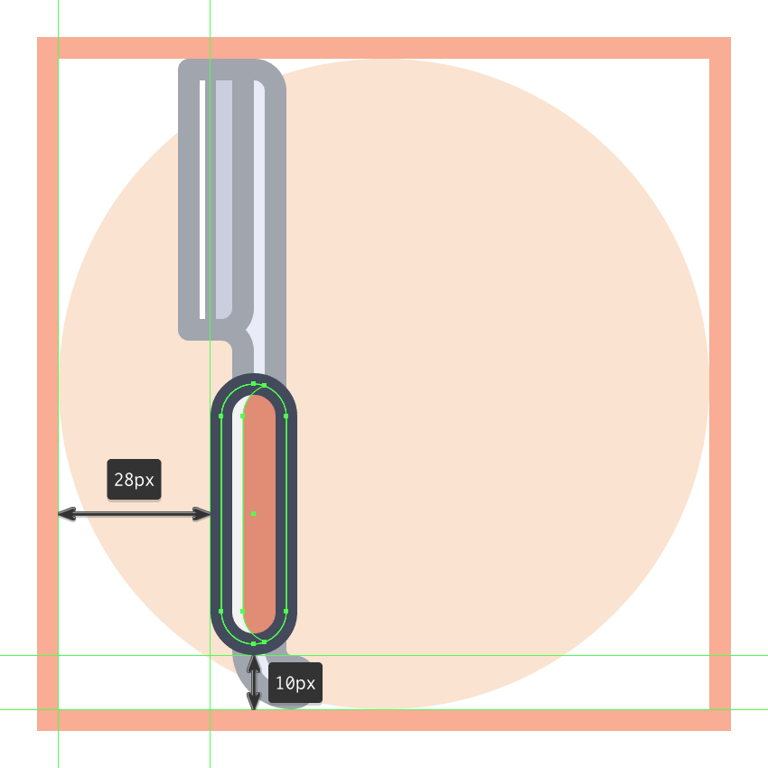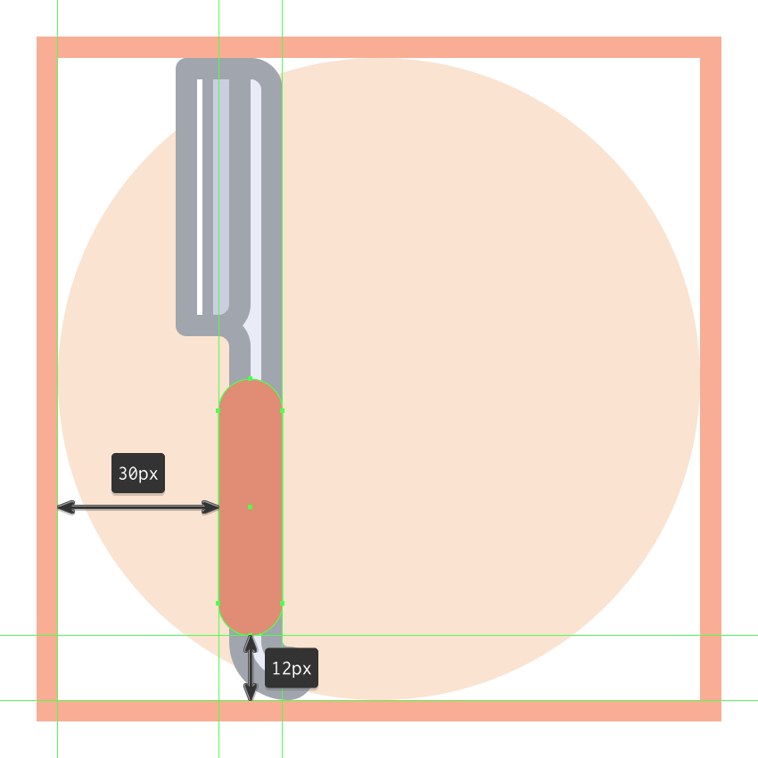 使用12 x 48像素圆角矩形(#E28D76)和6 像素圆角半径创建木质手柄部分,我们将在距离当前绘图区域的左边缘30像素和底部像素12像素的位置处定位。