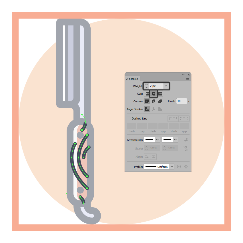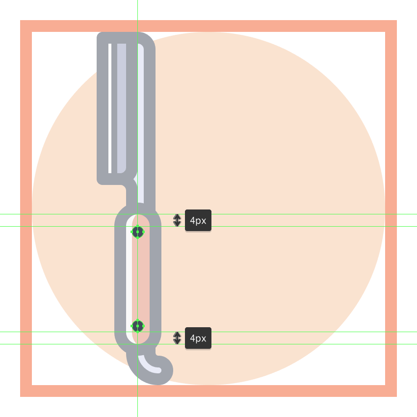 通过使用两个4 px宽2 px粗笔划线(#FFFFFF)与圆形笔帽添加水平高光,结束刀片,我们将如参考图中所示定位线。