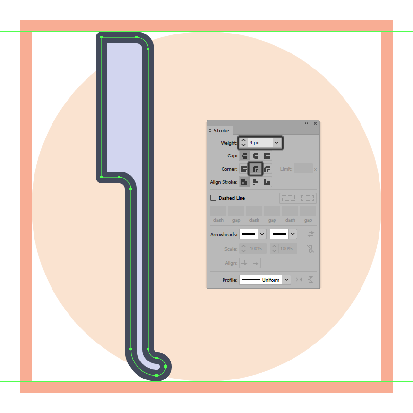使用Round Join 调整4 px厚轮廓(#41485B)的形状,然后使用Control-G键盘快捷键选择并将两个形状组合在一起。