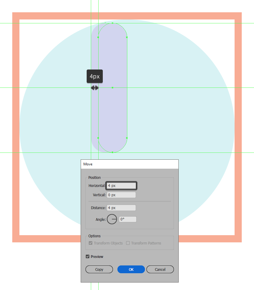 使用我们刚刚创建的形状的两个副本(Control-C)添加左侧的高光,我们将在前面粘贴(Control-F两次),确保将最上面的一个向右推动4 px,使用移动工具(右键单击>变换>移动>水平> 4像素)。