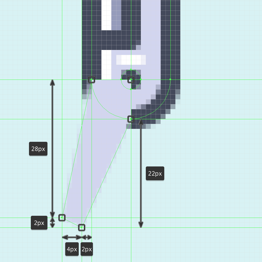 下一步,我们打开 Pixel Preview模式(Alt-Control-Y)并#D3D6EF使用钢笔工具(P)从螺丝中心开始绘制左小腿(),并一路向下。使用参考图像作为主要指南,完成后,关闭 像素预览模式(Alt-Control-Y)并继续下一步。