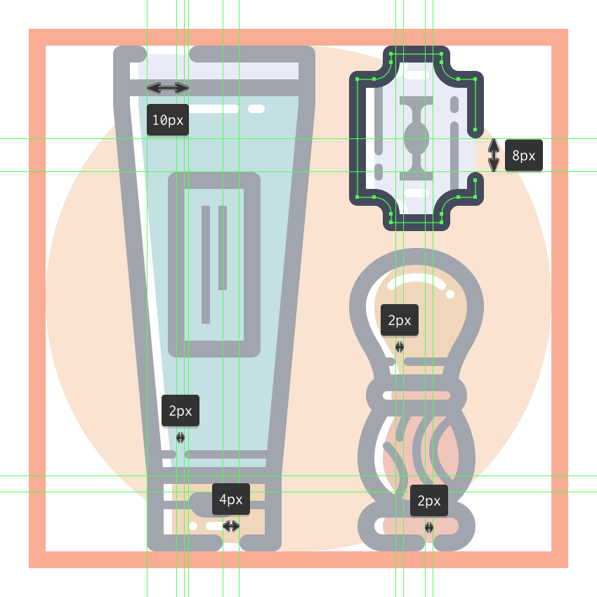 请花几分钟时间,然后使用拱形的2 px粗笔划线(#FFFFFF)和2 x 2 px圆(#FFFFFF)来添加水平高光,然后我们将位于设备握持部分的下方。一旦你有了这两个,选择它们和当前部分的所有组成形状,并使用Control-G 键盘快捷键将它们组合在一起。