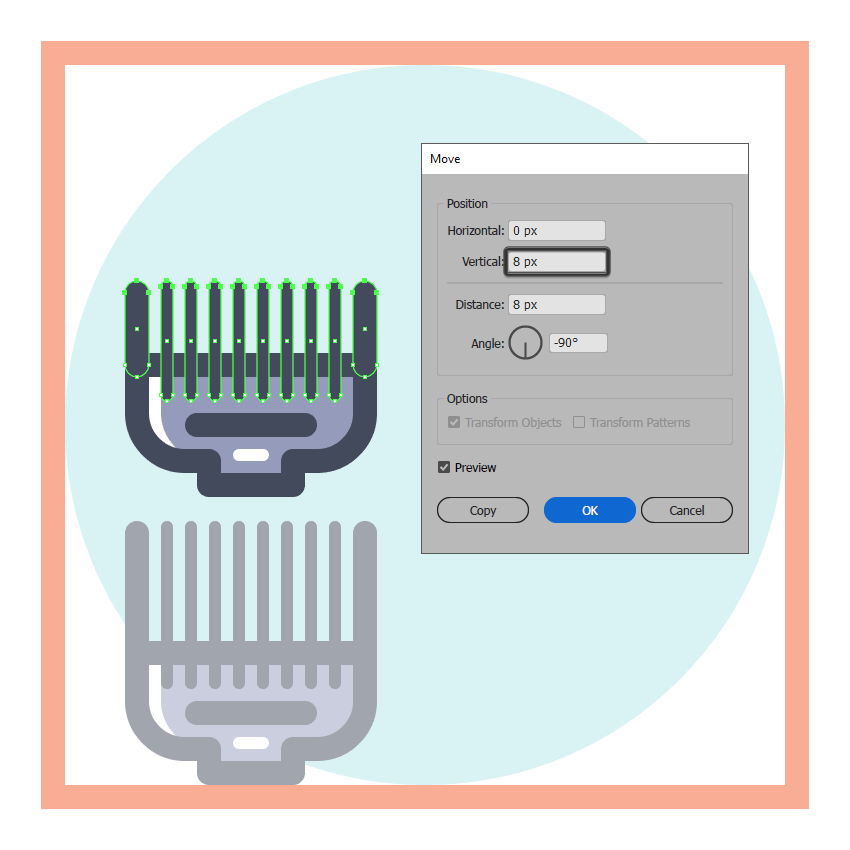 开始通过缩短它的外桥梁和牙齿,通过选择它们的顶部锚点,然后通过将他们推向底部调节梳8 PX使用移动工具(右击>变换>移动>垂直> 8像素)。