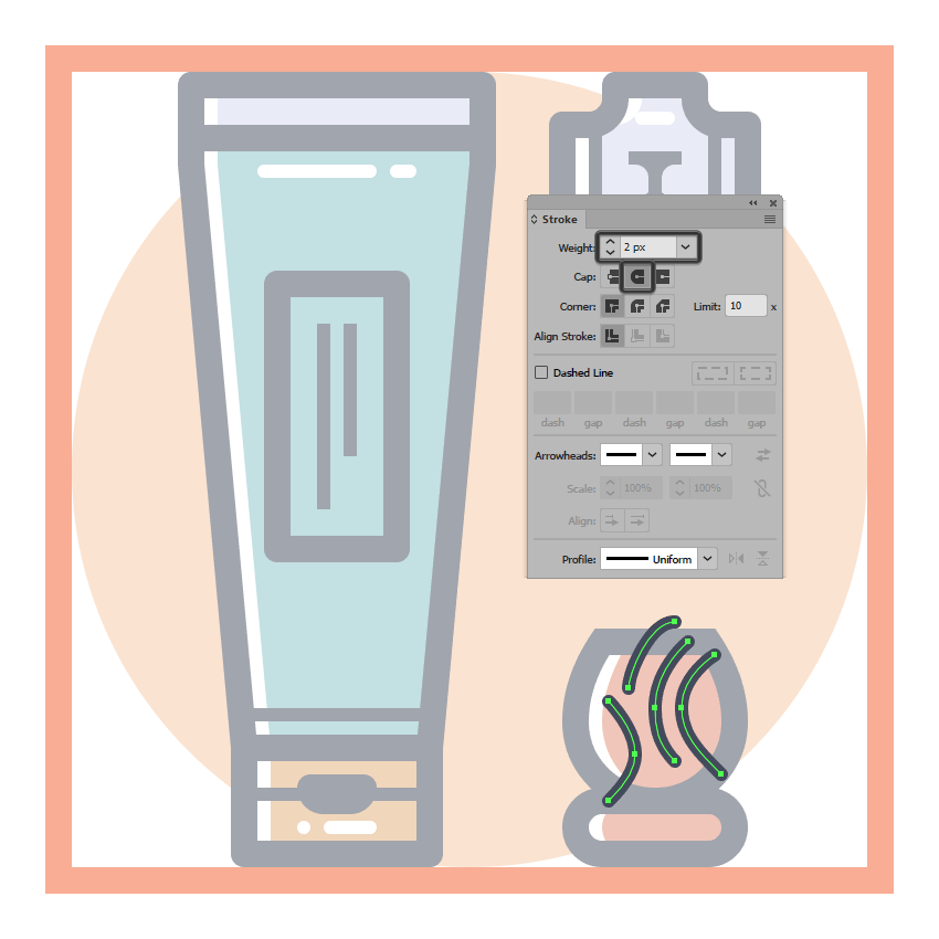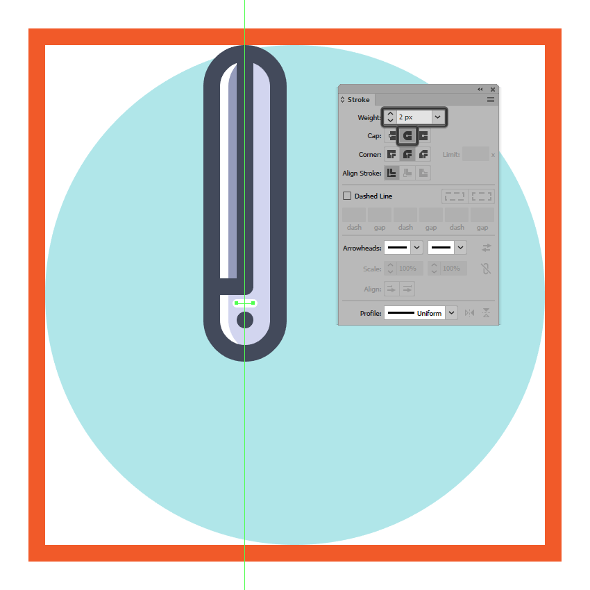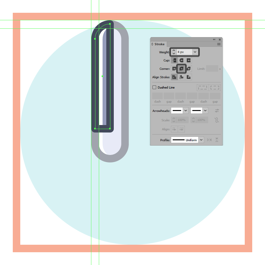 使用带有圆帽的4 px宽2 px粗笔划线(#FFFFFF)添加水平高光,我们将在底部部分的下端和我们在上一步中创建的螺丝之间进行定位。完成后,选择并分组(Control-G)到目前为止我们所有的形状,然后再进入下一步。