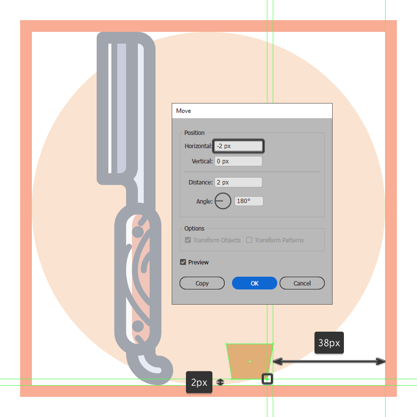 通过创建一个16 x 12 px矩形(#E2AF79),开始处理管帽,我们将通过使用移动工具(右键单击>变换>移动>水平)单独选择并将其底部的锚点向内按 2 px进行调整> - 2 px)。完成后,将生成的形状放置在距活动绘图区域右边缘38像素处,将其与底部像素边缘相距2像素处。
