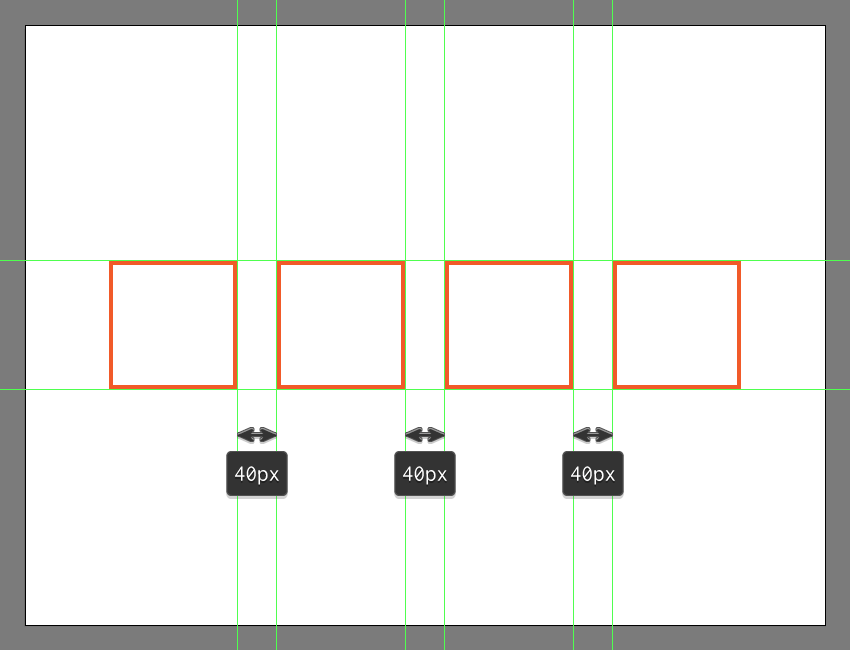 使用Control-G 键盘快捷键选择并将这两个方块分组在一起,之后将它们对准底层的Artboard。使用横向间距为40 px的三个副本(Control-C> Control-F三次) 创建其余网格,在移至下一节之前锁定当前图层。