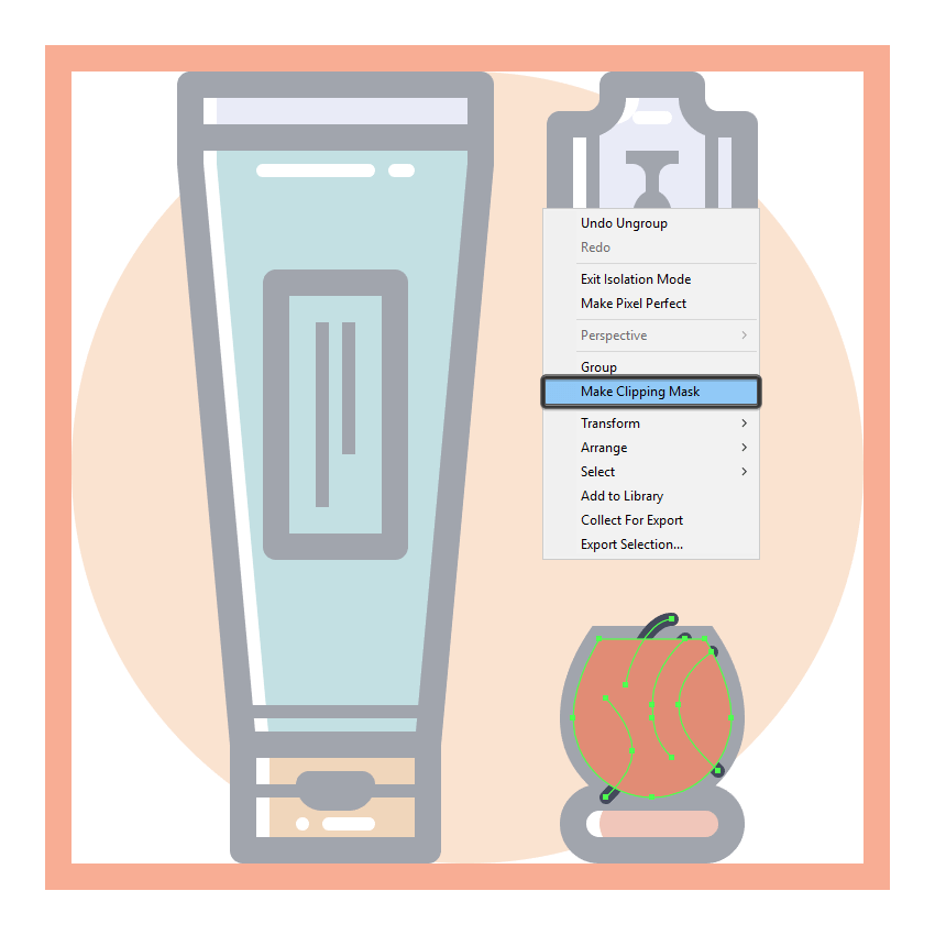 由于我们希望线条仍然局限于喷粉器主体的表面,因此我们必须使用较大底层填充形状的副本(Control-C)来掩盖它们,我们将在前面粘贴(Control-F) 。然后,只需选择我们想要遮罩的形状,然后复制并右键单击>制作剪贴蒙版。完成后,使用Control-G键盘快捷键选择并将所有当前部分的组合形状组合在一起。
