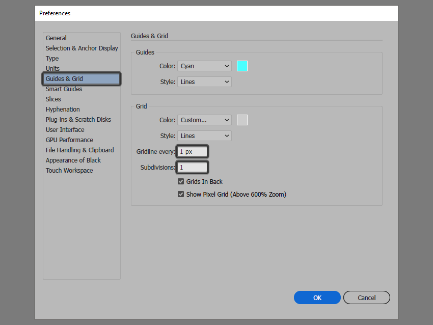 转到编辑>首选项>指南和网格子菜单,然后调整以下设置: