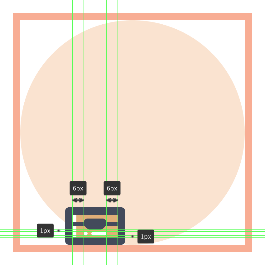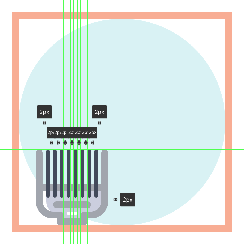 通过使用8 px宽 2 px粗笔划线(#FFFFFF)与水平距离为 2 px的较小的2 px宽的一个(#FFFFFF)(我们将分组(Control-G))和然后居中对齐距底层形状底边2 px的距离。完成后,在继续下一步之前,选择并分组(Control-G)当前部分的所有组成形状。