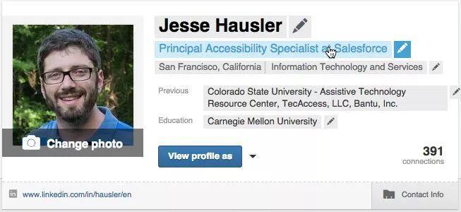 立刻出现了一些视觉提示,告诉我可以分别编辑这张card上的许多信息,包括姓名、职位、之前工作、教育经历、个人头像照片。