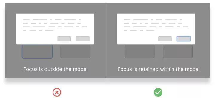 右边正确做法:焦点落在2个按钮上,用户可选择相应操作,或者关闭弹窗。