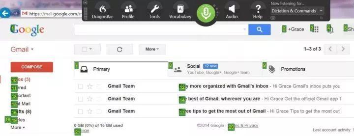 下图是使用 Dragon Naturally Speaking 的 Gmail 截图,叠了一层有数字编号的超链接。用户可以说出数字,并与相应的链接交互。如果一个链接默认不显示,只有 hover 时才显示,那可能就只能在空白处显示一个数字。