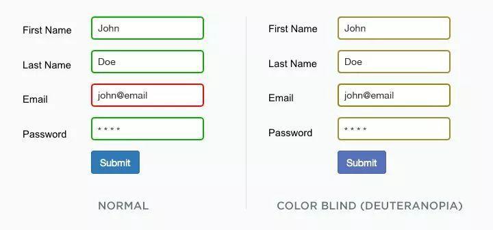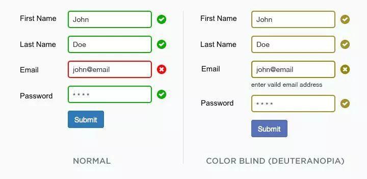 举个例子,下面的 input 中,视力正常用户能轻易分清 Email 是错误状态,但色盲用户就完全看不出。