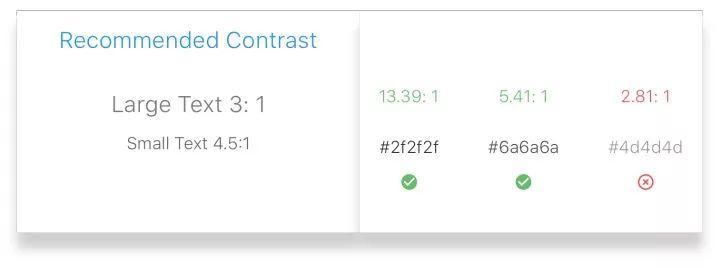 根据According to the WCAG, 标准,文字和背景色的对比度至少是4.5:1;如果是大于等于24 px/ 19 px bold 的文字,对比度至少是3:1 。这项规范可以帮助视力障碍用户更好地使用互联网产品。