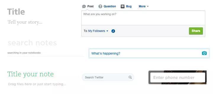 Input 是常被人忽略的一个方面。下图7个 input 的例子,只有「Search Twitter」的对比度足够高,满足「无障碍设计标准」让人看得清。