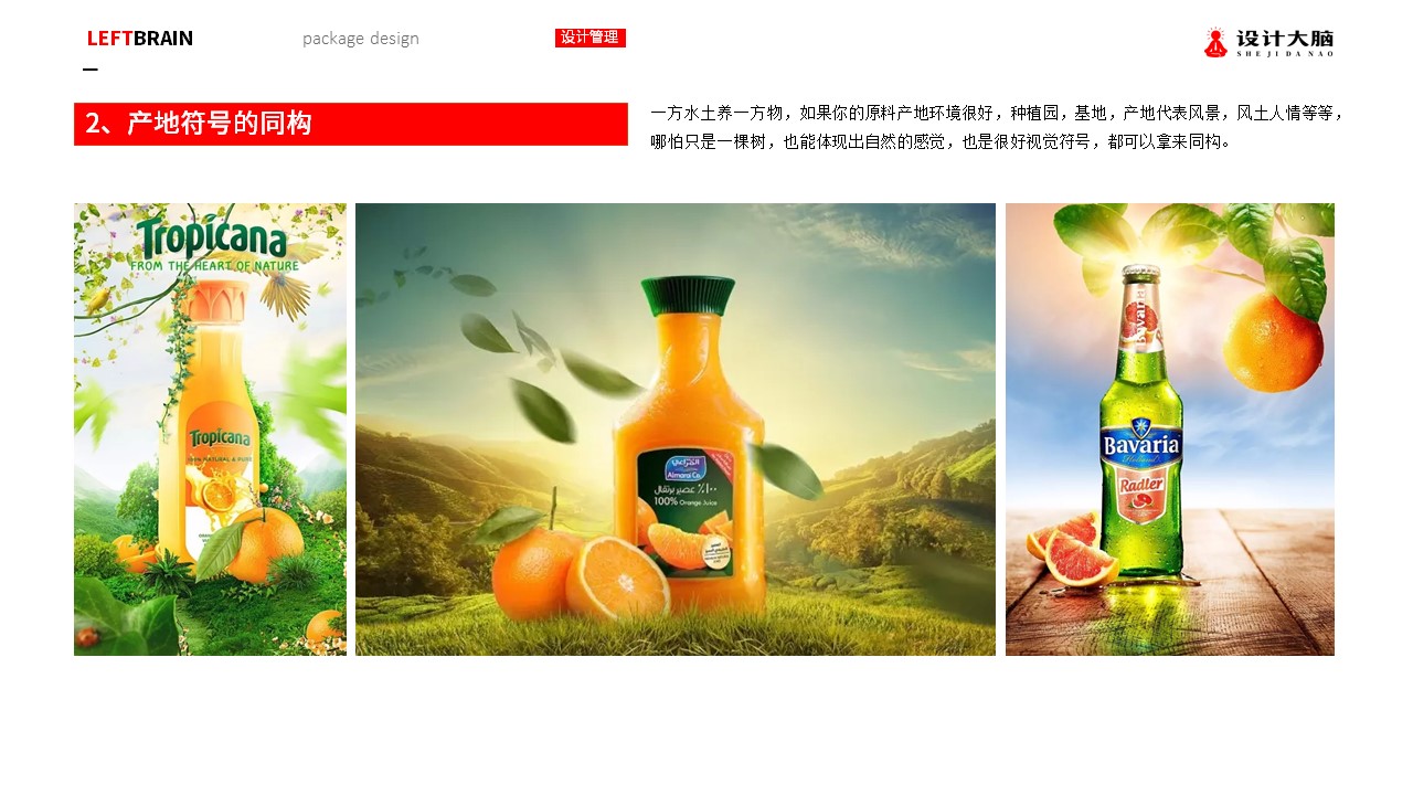 一方水土养一方物,如果你的原料产地环境很好,种植园,基地,产地代表风景,风土人情等等,哪怕只是一棵树,也能体现出自然的感觉,也是很好视觉符号,都可以拿来同构。