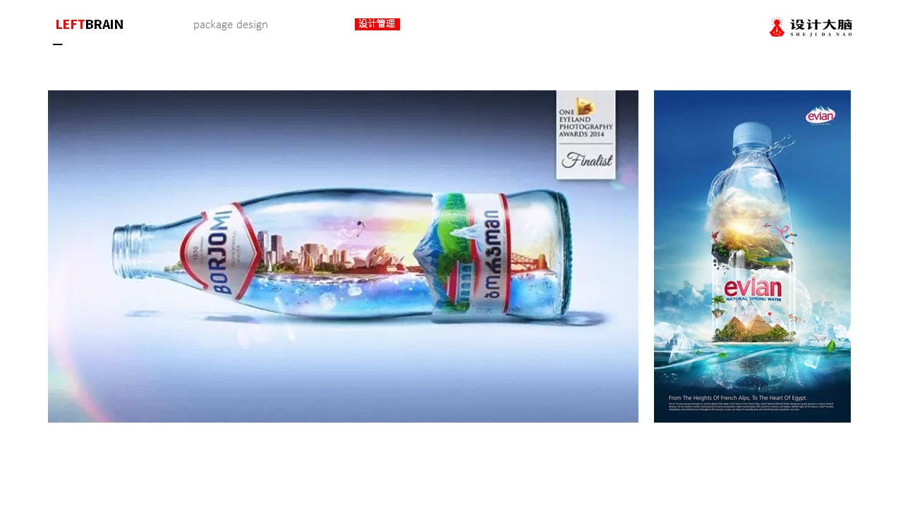 如果你的瓶子形态很特别,那么可以作为一个品牌符号强调,如果是普遍的甁形,别忘了贴上标签。