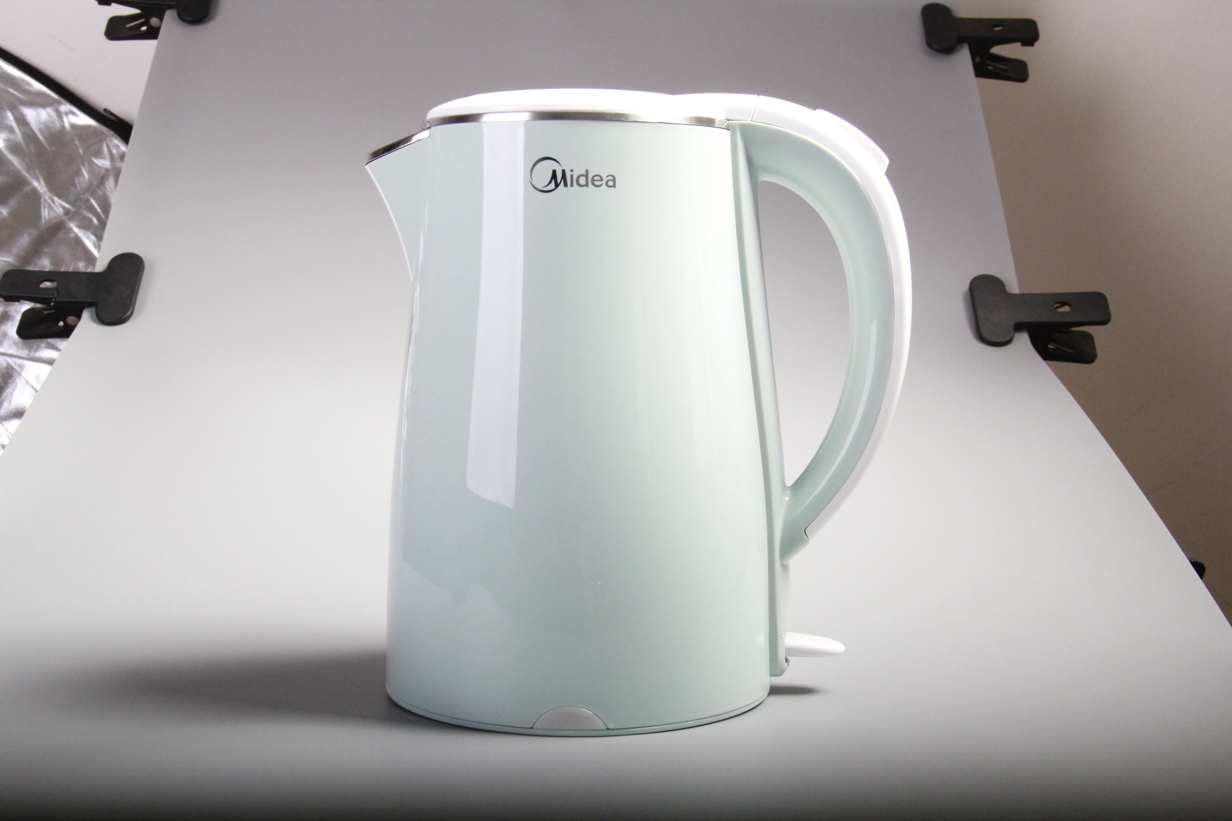然后拍出了下面这张效果,光是柔下来了,可是这个光好奇怪,我想来想去感觉应该是摄影台子太低了,左侧那道柔和的光没有能够延伸到壶底部边缘,还有右侧的两个窗户的反光也感觉不爽。准备明天继续练习进行改正,今天练习的时间已经超出预算了。
