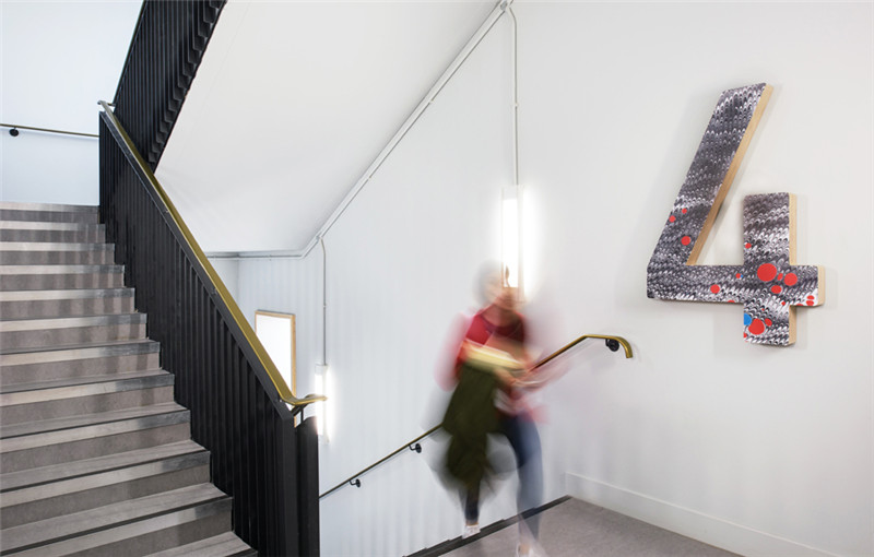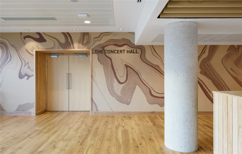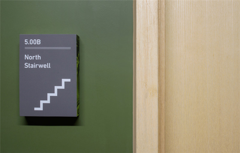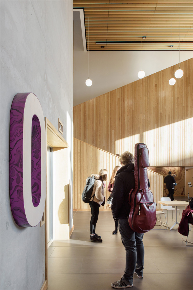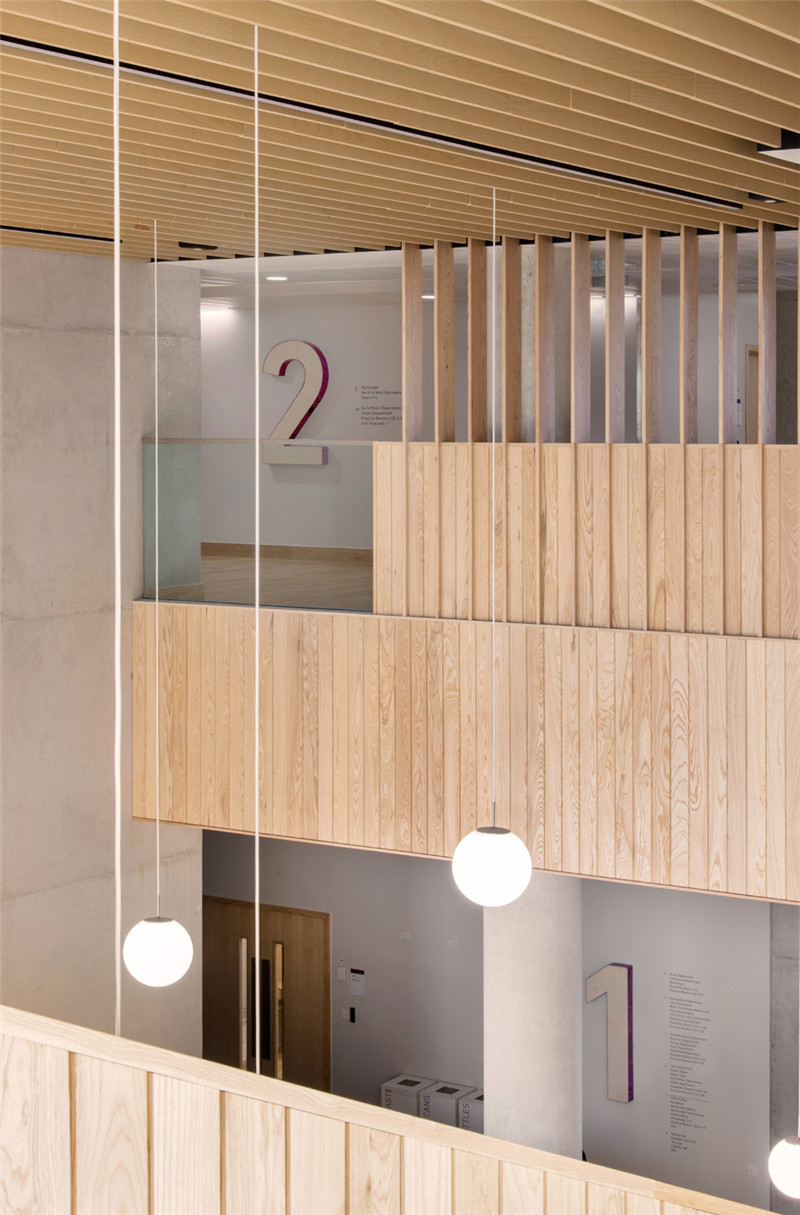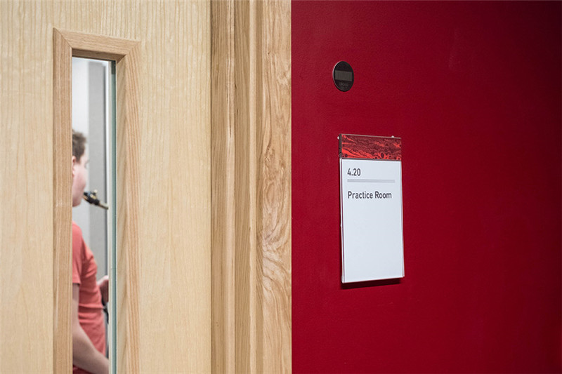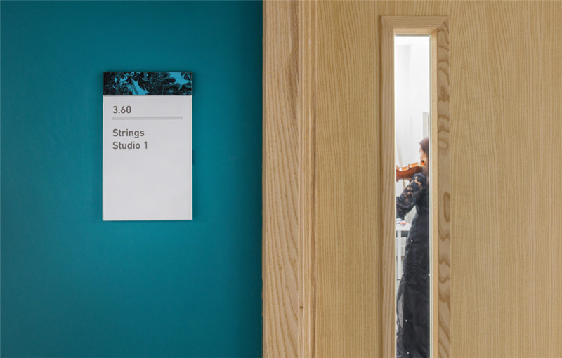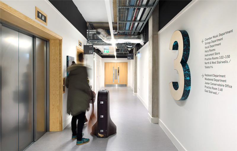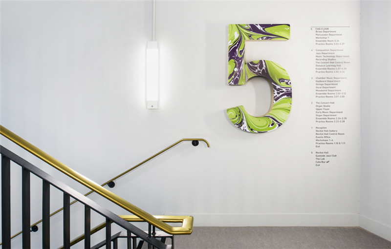 新建筑满足现代音乐学院的教学、艺术、表演等需求,导视系统则是作为建筑与学院悠久传统的视觉联系。为了创造这种传统的视觉联系,与大理石花纹设计师Jemma Lewis合作,为每个楼层开发定制独特的数字标识,个性大胆的楼层示意数字与简洁精炼的黑色文字信息形成对比,创造了一个引人注目、传达音乐学院艺术氛围的导视系统。