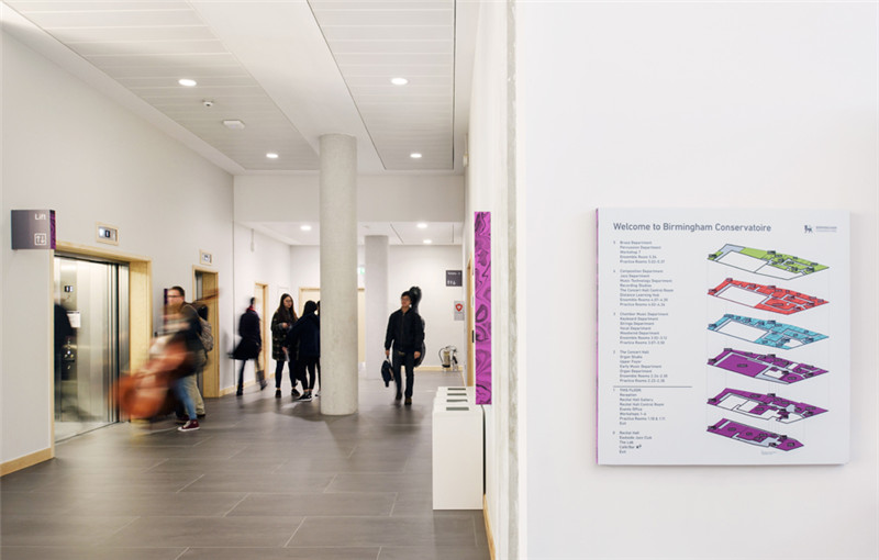 英国伯明翰皇家音乐学院位于欧洲艺术中心"伯明翰市",是欧洲最出色的音乐学院之一,隶属于伯明翰城市大学。 伯明翰音乐学院在搬迁至伯明翰城市大学市中心校区的由建筑师Feilden Clegg Bradley Studios设计的新大楼之后,Thomas.Matthews受邀为其创建符合学院形象的导视系统。
