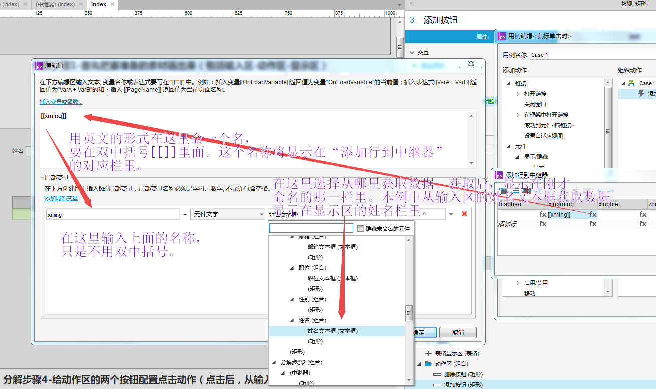 在“添加行到中继器”的弹框中,从“xingming”栏起,到“youxiang”栏,分别点击“fx”,在弹出的“编辑器”中,在第一个输入框里命个名比如:[[xming]],在第二个输入框中也输入相同的名称,只是去掉双中括号。然后选择“元件文字”(如果后面的数据是下拉选择的,则在这里要选择“被选项”),在最后一个输入框中选择输入区的某个文本框(数据的输入位置)。
