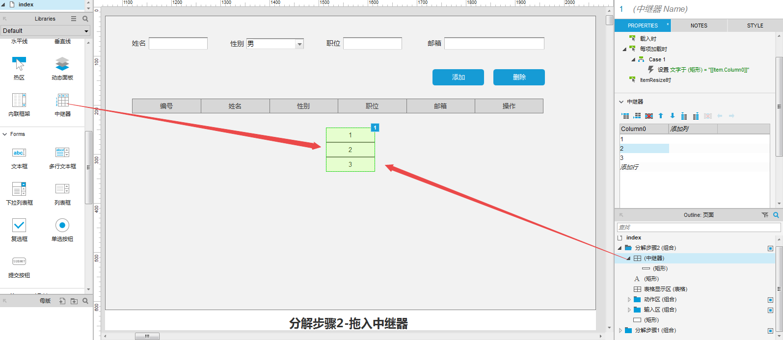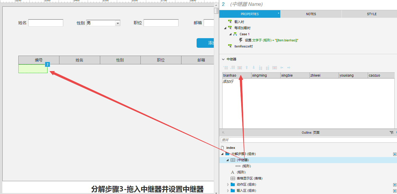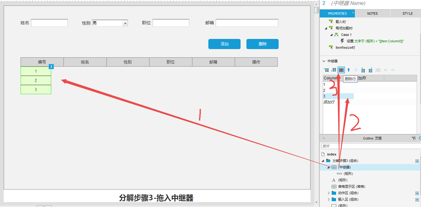 选择中继器,①将中继器拖到与表格标题左对齐;②在中继器的属性栏把默认的三行删除。
