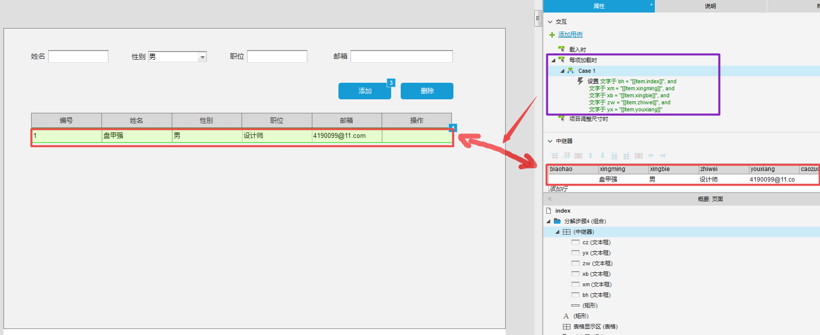 ★思路: 当点击“添加”按钮时,中继器增加一行的同时将输入区的数据显示在新增的行中。