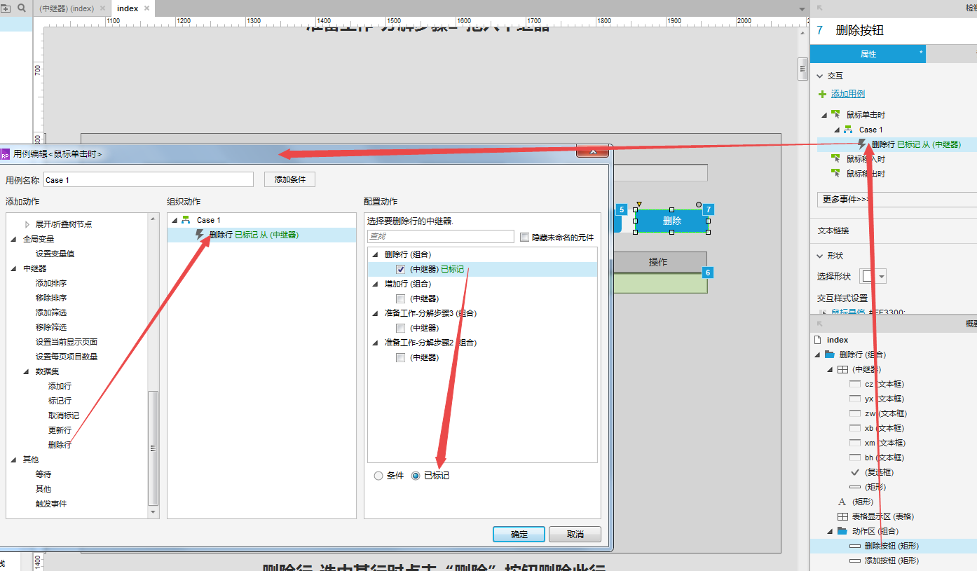 选择删除按钮-选择鼠标单击时-在弹出的用例编辑器中选择(删除行-选择对应的中继器-勾选已标记)。