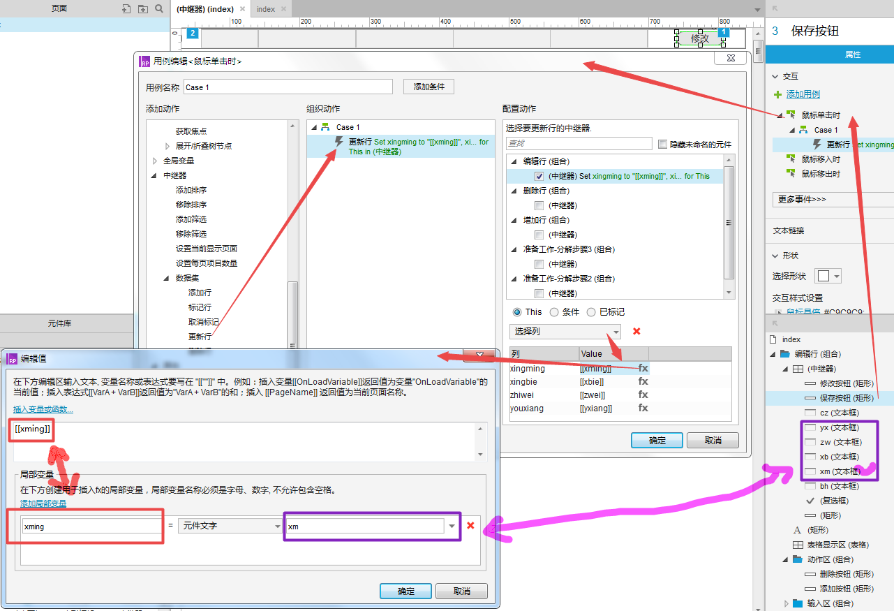 选择保存按钮-选择鼠标单击时-在弹出的用例编辑器中(选择中继器-数据集-更新行-选择相应的中继器-选择This-选择中继器中相应的列-点击相应列后的fx-在弹出的编辑值弹框中设置值得来源地(比如xingming的来源地在这里设置为从中继器的xm文本框中获取))