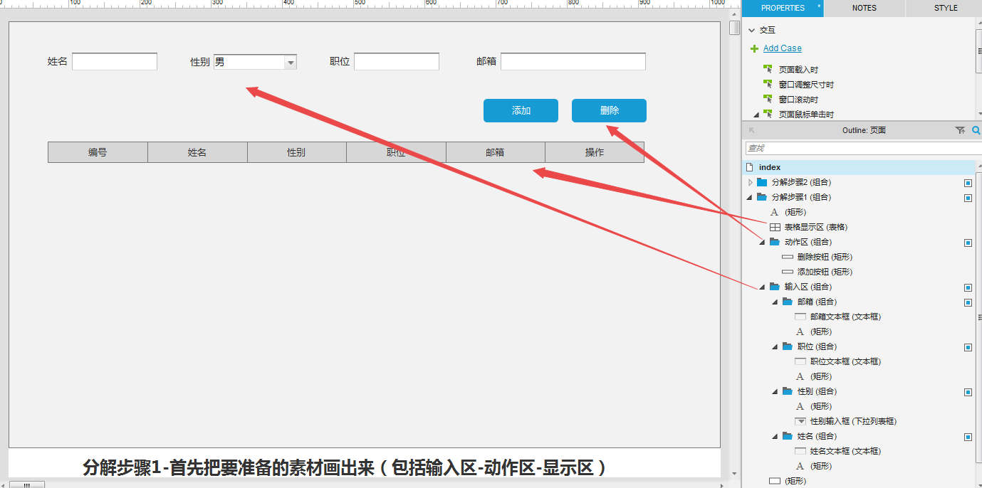 领悟 :到此,明白了那六个文本框是用来给表格分栏并显示中继器从输入区获取的数据。
