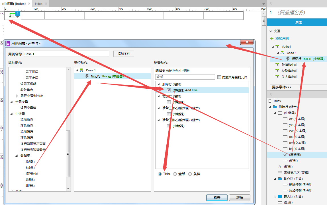 选择复选框-双击选中时-在弹出的用例编辑器中选择(中继器-数据集-标记行)-选择对应的中继器-选择:This。