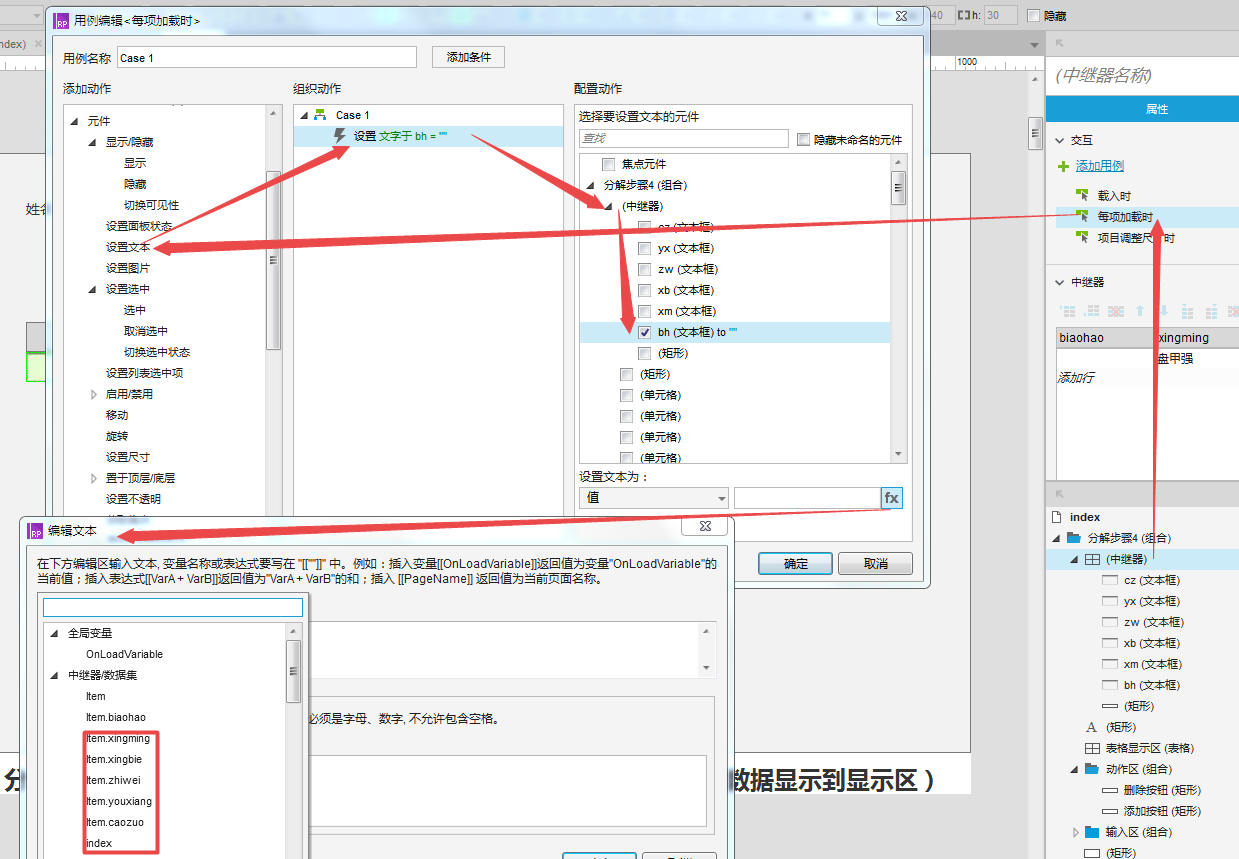 选择中继器-选择每项加载时-选择设置文本-分别选择中继器中的文本框-点击fx-选择对应的中继器标题名称。