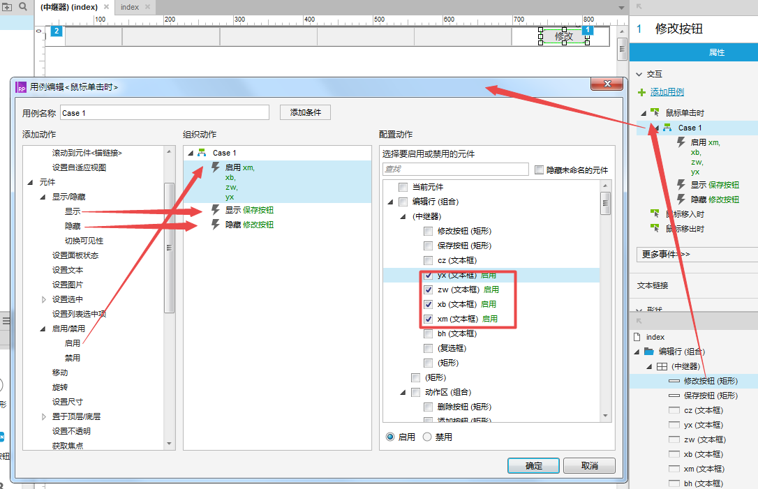 选择修改按钮-双击鼠标单击时-在弹出的用例编辑器中(选择元件-显示/隐藏-显示保存按钮/隐藏修改按钮)(选择元件-启用/禁用-启用相应的文本框)