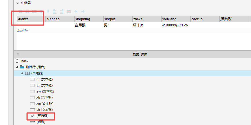 为了达到这个目的,首先在中继器中加入复选框,并在中继器属性标题栏中新增一栏“xuanze”用来放置复选框。