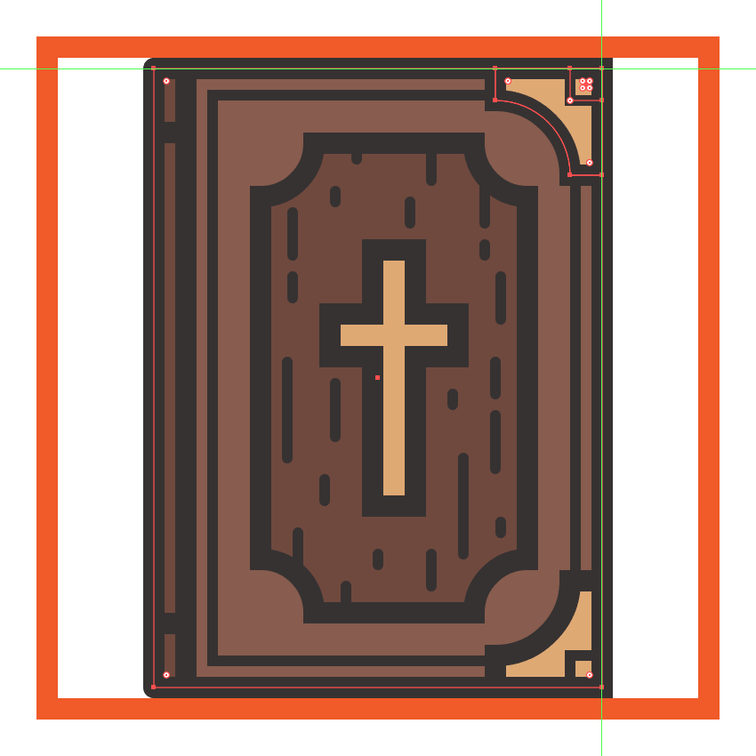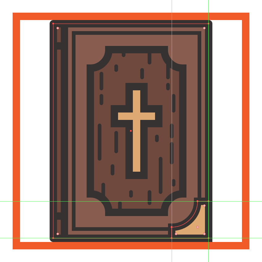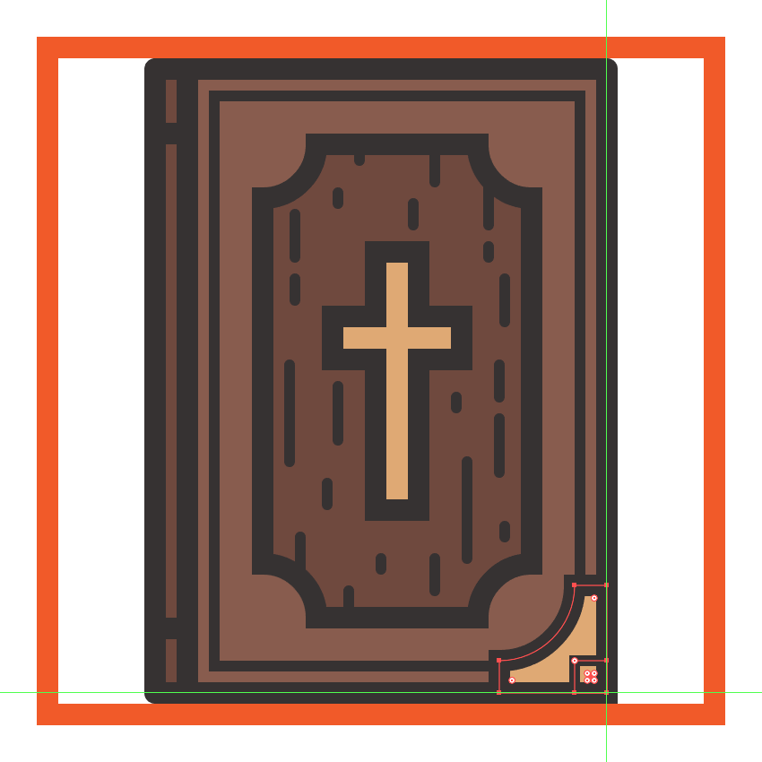 通过创建一个20 x 20 px的矩形(#E0AA75),开始在较低的金色角落上工作,我们将通过从其左上角切出一个28 x 28像素的圆圈来进行调整。用一个尖角连接给出生成的形状为4 px粗的轮廓(#332E2E),然后将这两个对齐到圣经主体的右下角。