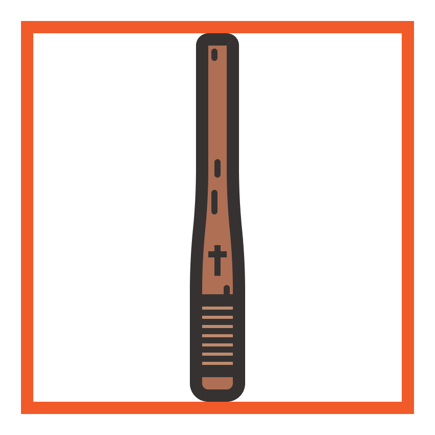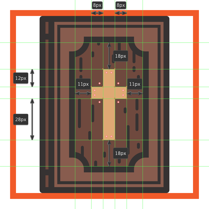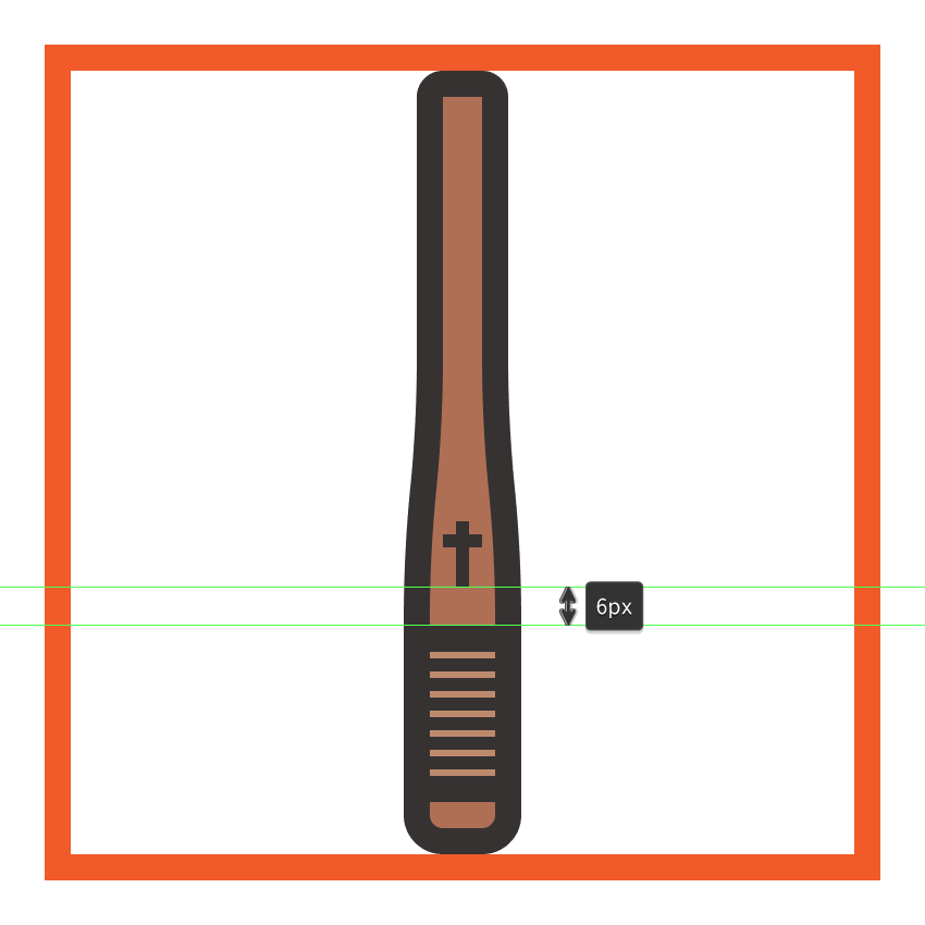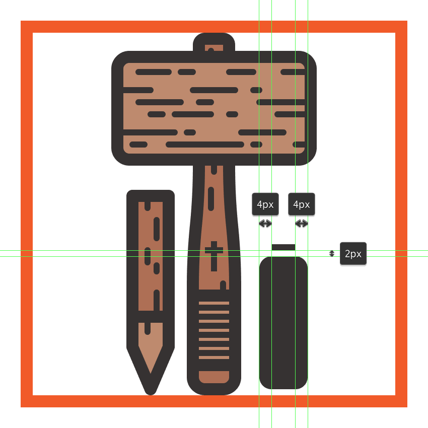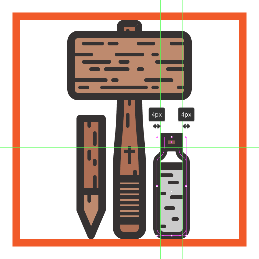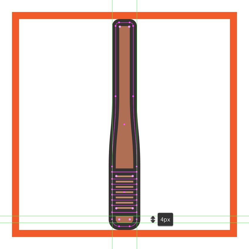 使用带有4 px轮廓()的14 x 23 px矩形(#BF8B6F)创建手柄部分,其中我们将添加一组6个2 px粗细的水平细节线(),垂直堆叠 1 px。完成后,将(Control-G)分组的所有部分组成元素,然后居中对齐它们与底层形状,距离其轮廓4 px。#332E2E#332E2E