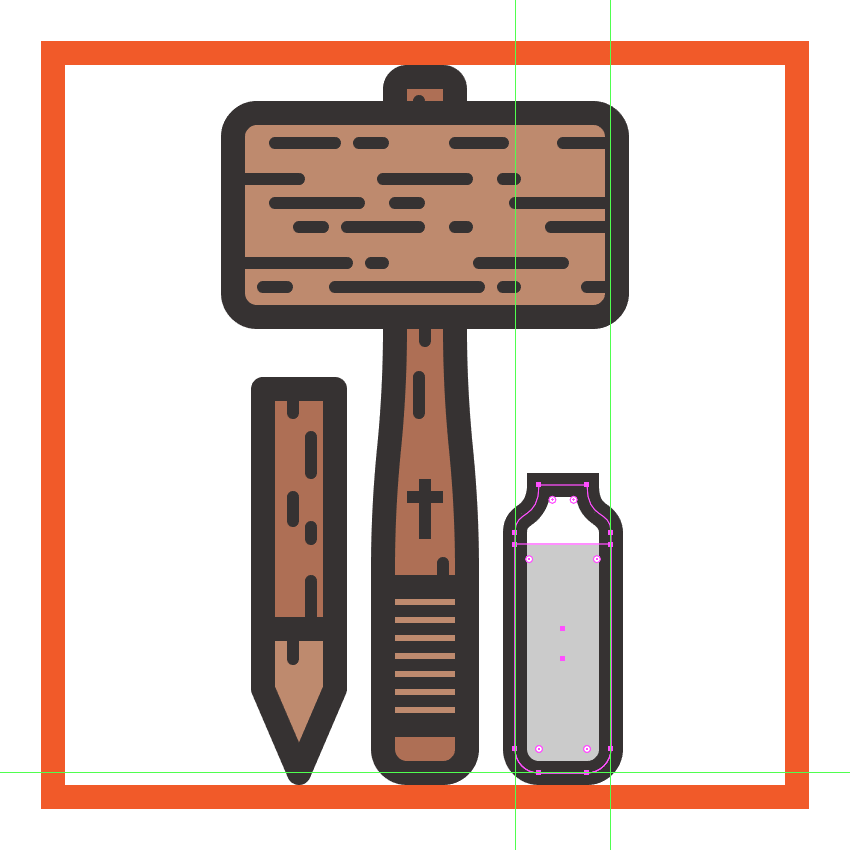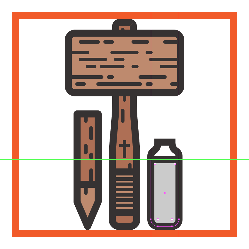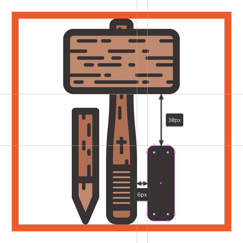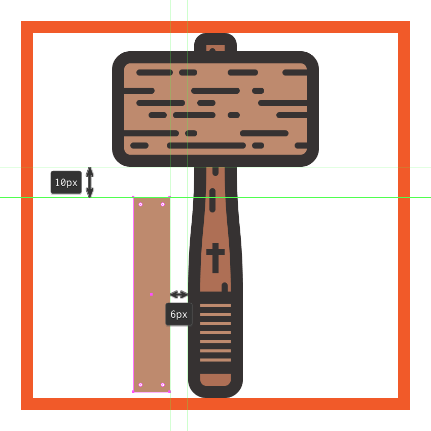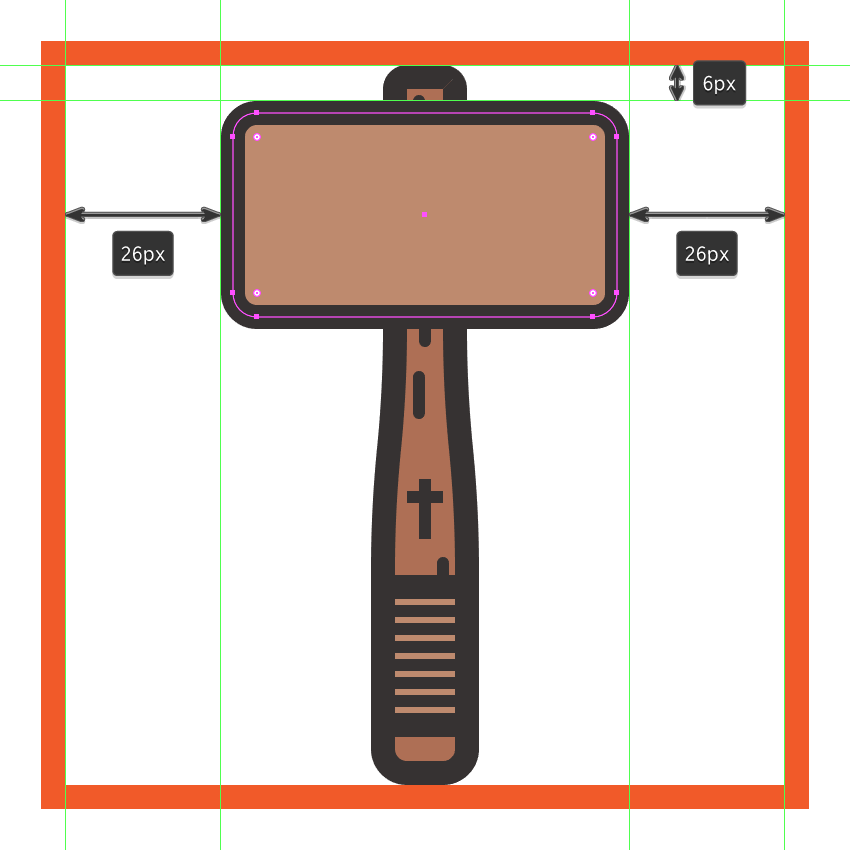 创建使用锤的头部64×34像素圆角矩形(#BF8B6F带)4 PX圆弧半径, 和一个4 PX轮廓(#332E2E),我们将组(控制-G在距离),然后中心对齐到底层手柄,距离当前绘图区域的上边缘6 px。