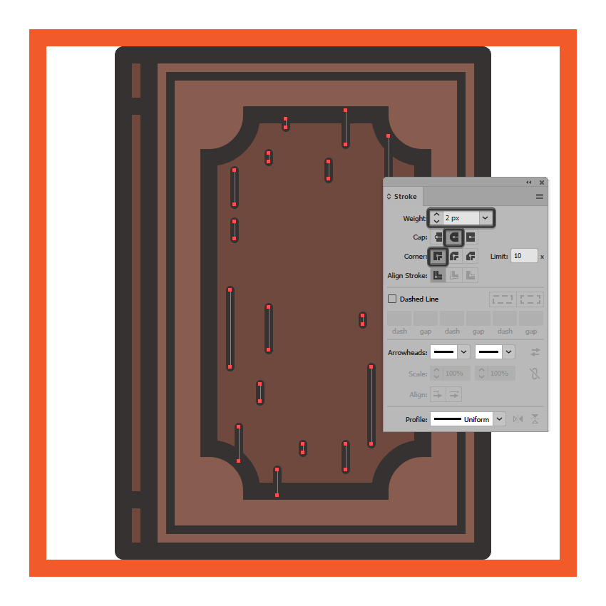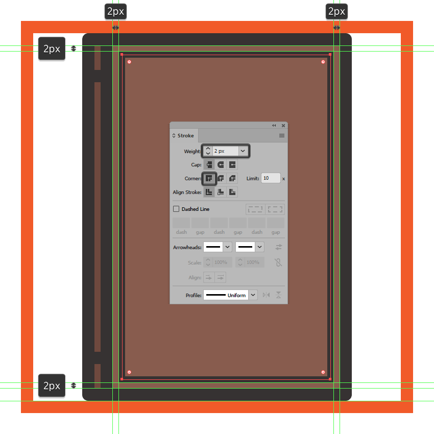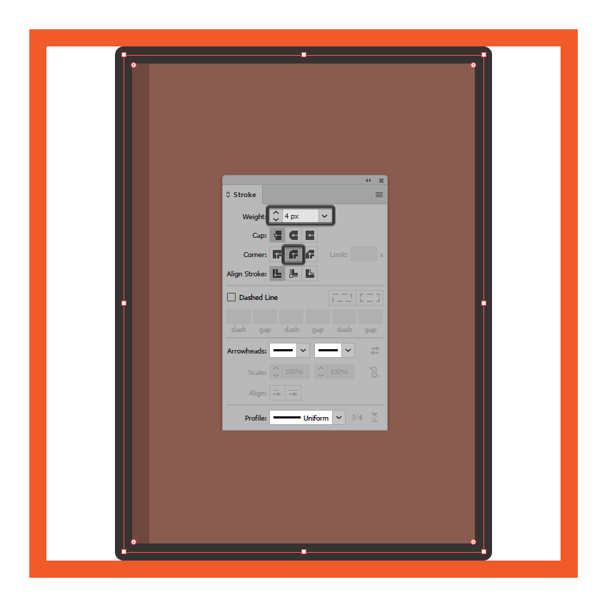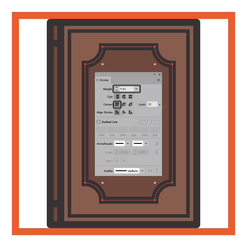 使用钢笔工具(P),使用相同的4 px厚的笔画(),绘制封面较暗部分的垂直轮廓线#332E2E,确保其定位点与较大轮廓的路径重叠,底层矩形。