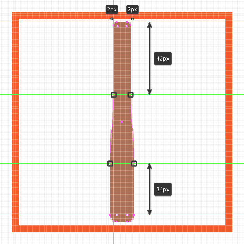 切换到 像素预览模式(Alt-Control-Y),然后抓取添加定位点工具(+)并 在距离形状的顶部边缘42像素的距离添加一对定位点,并从另一对 34像素它的底部边缘。然后,使用移动工具(右击>变换>移动> + / - 2 px,具体取决于您以哪个锚点开始),单独选择并将顶部中间的元素向内移动2 px。