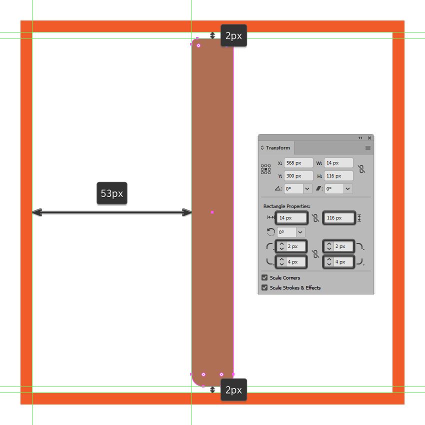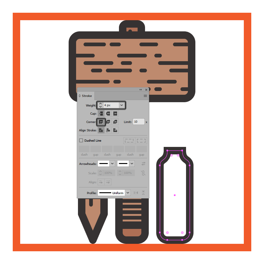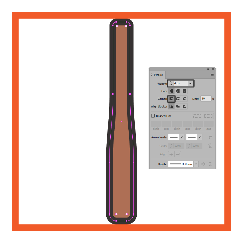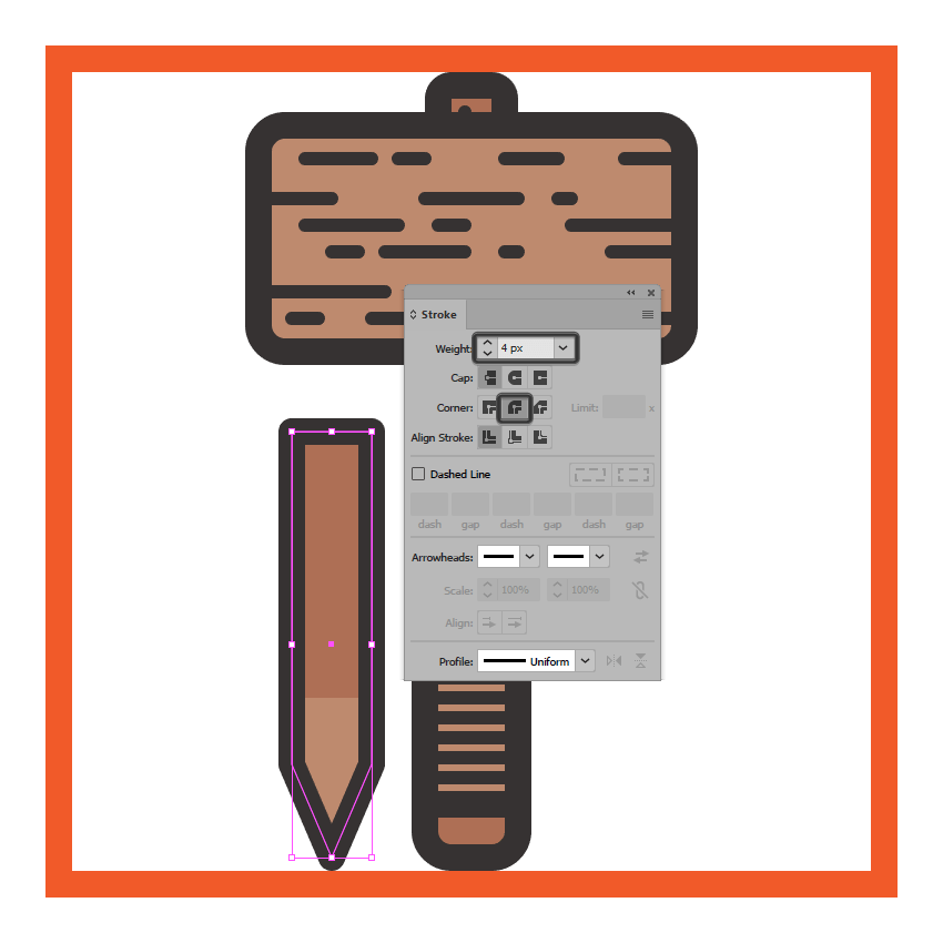 创建一个稍微短一点的12 x 40 px矩形(#AF7054),放在我们刚刚调整过的那个上面,然后添加4 px粗轮廓(#332E2E),将角设置为 圆形加入。