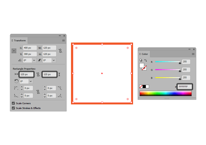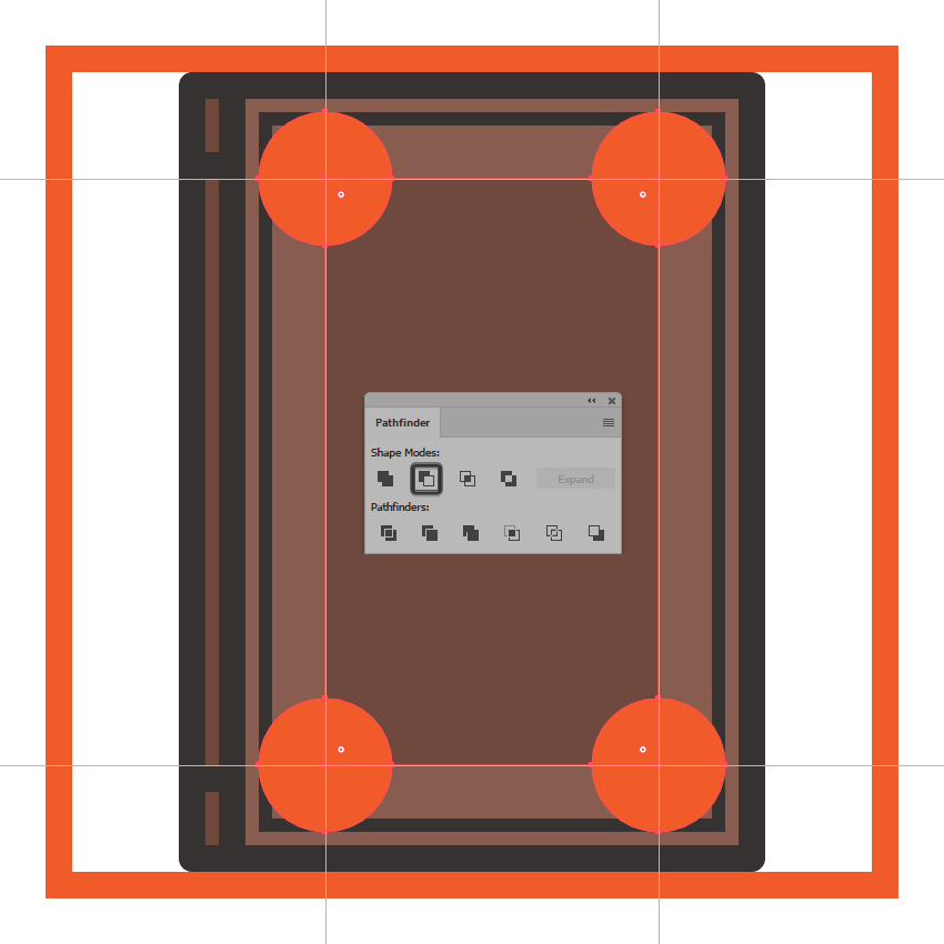 根据上一步调整形状,在每个角上放置一个20 x 20像素圆圈(用橙色突出显示),然后使用Pathfinder的减号前端形状模式将其切除。