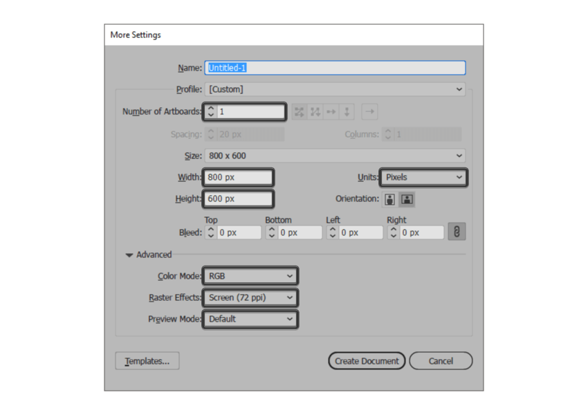 由于我确定您已经在后台启动并运行了Illustrator,因此请将其启动,然后使用以下设置设置新文档(文件>新建或控制-N):
