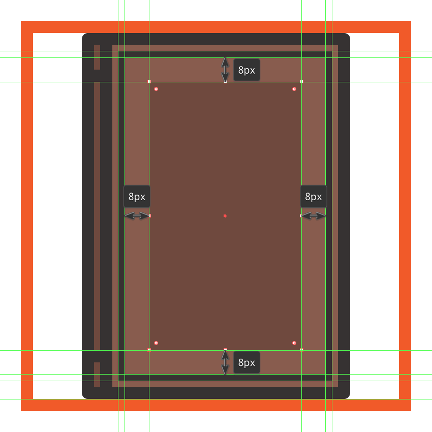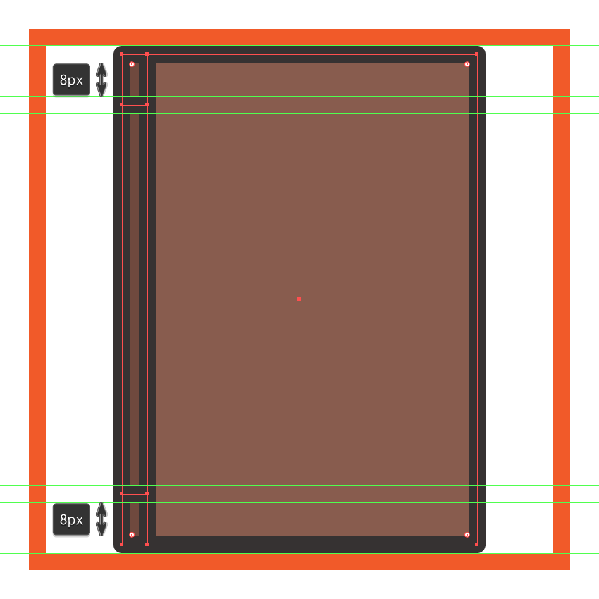 添加两条8 px厚度的水平分隔线(#332E2E),在封面的每边放置一个,距离较大轮廓的外边缘8 px,然后选择并分组(Control-G)所有封面的构图形状。