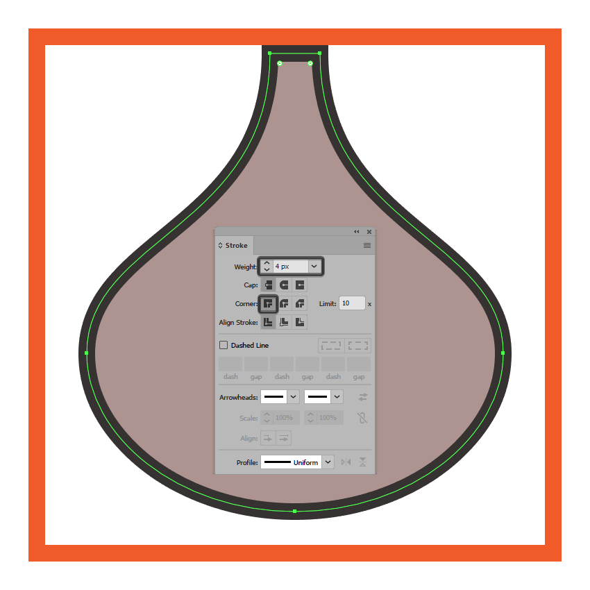 使用直接选择工具(A), 选择矩形的底部锚点和圆角矩形的顶部锚点,并通过按下删除将它们删除,通过双击Control-J将两个路径联合起来。然后,使用与大蒜身体相似的工艺,调整过渡部分的曲率,用4 px厚的笔画翻转所得形状的填充物(#332E2E)。