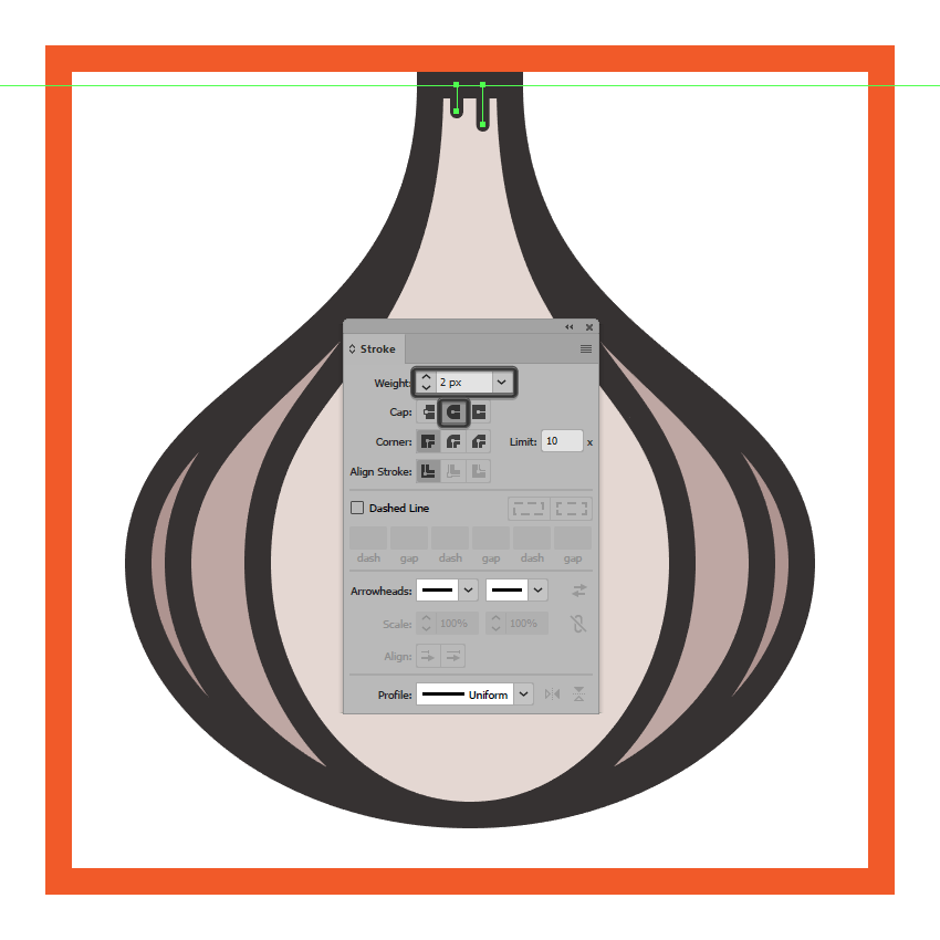 使用钢笔工具(P),将两条垂直细节线绘制到大蒜身体的顶部,使用2 px厚的笔触,颜色设置为#332E2E和 Cap to Round。完成后,选择并将两者合并(Control-G),然后对图标的其余组成形状执行相同的操作。