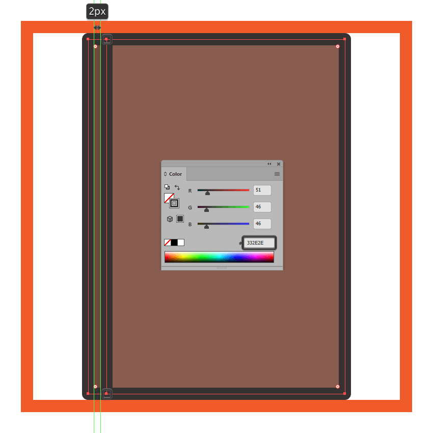 使用矩形工具(M),创建一个68 x 106像素形状(#332E2E),我们将变成2像素厚的轮廓,然后将其置于覆盖层上,将其对准其较亮部分的中心。