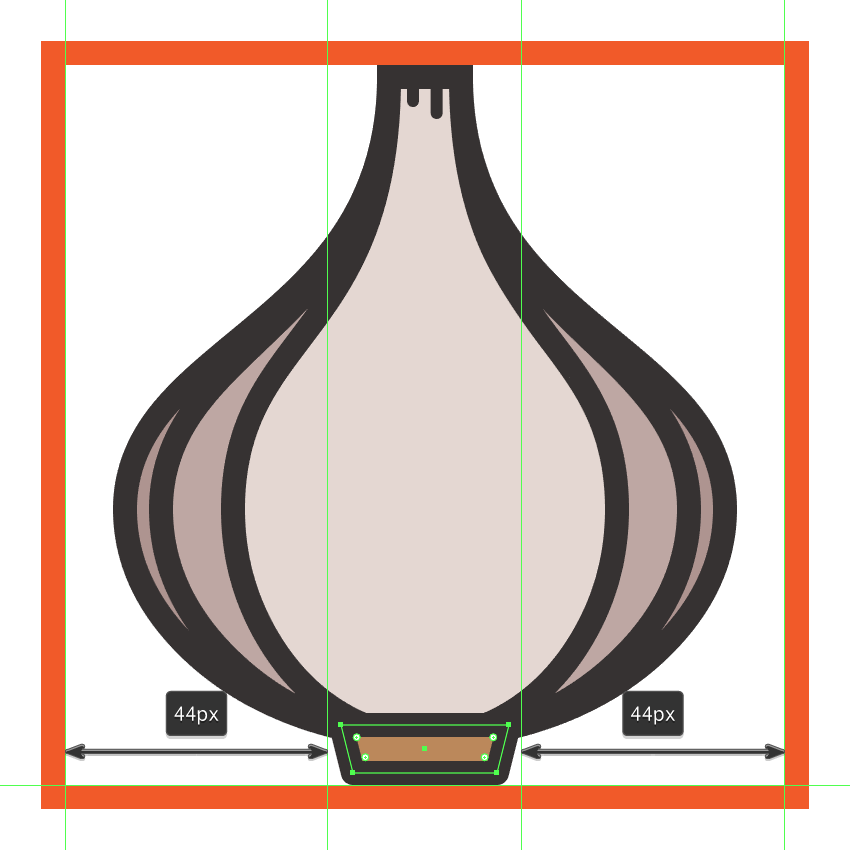 使用一个28 x 8 px矩形(#BC895B)创建大蒜的底部部分,我们将通过单独选择其底部锚点 并将它们推向内部2 px(右键单击>变换>移动> + / - 2 px来调整,取决于哪个你开始的锚点)。使用圆形连接将生成的形状绘制为4 px厚的轮廓(#332E2E) ,然后居中对齐底层活动绘制区域的底部边缘。