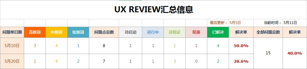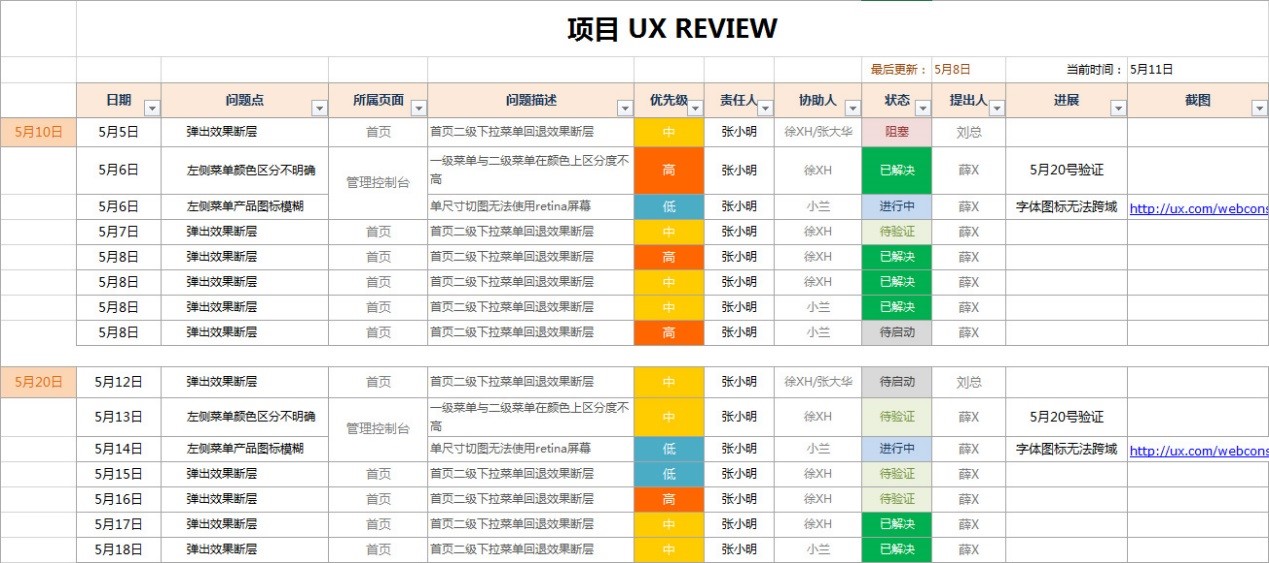 很多时候产品或者交互在和开发或者老板过进度的时候,常常是以静态的Excel表去核对进度,往往把Excel当成了带表格的word,Excel强大的函数功能和图表统计功能却没有用到,如下通过一个在项目中遇到的一张问题点review表格,加入简单的函数与筛选功能让review “可视化“,从而“动”起来。