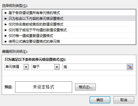 然后点击格式,即可设置匹配“高”级别设置颜色或者背景即可,对于中、低级别,依次新建规则,等于-中,等于-低,设置格式即可。