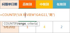 =COUNTIF( ' UX REVIEW ' ! G4:G11 在后面依次输入, “高”按回车即可(有逗号)。完整格式如下: